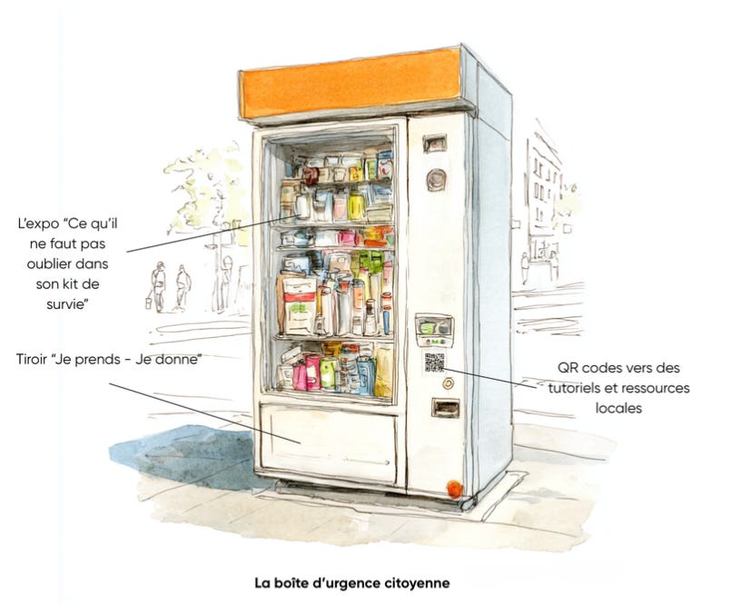 La boîte n’est pas isolée : elle est reliée à un réseau d’acteurs (associations, commerces, mairie, écoles) et à des dispositifs plus massifs (stocks municipaux, plans communaux de sauvegarde…). Elle en est l’interface visible.